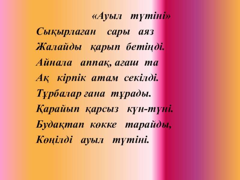 сөйлеу тілін дамыту,өз ойын еркін, жатық жеткізе білуге одан әрі дағдыландыру,мәнерлеп оқу дағдысын қалыптастыру.