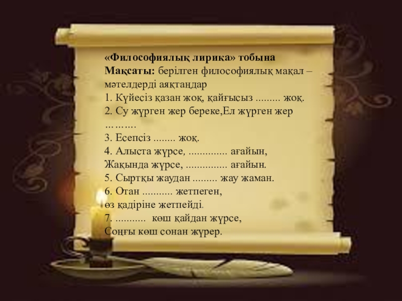 Мақсаты: берілген философиялық мақал – мәтелдерді аяқтаңдар