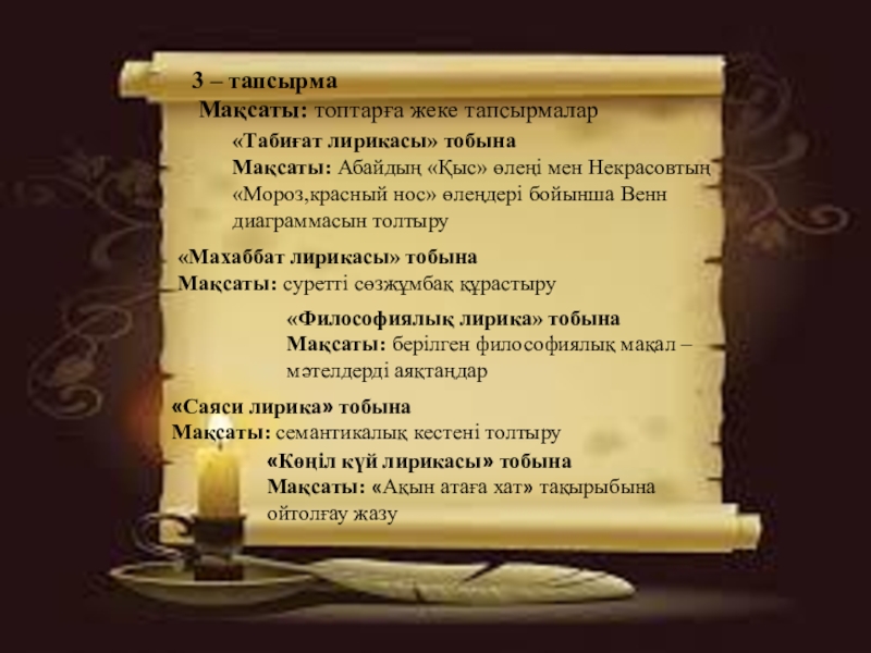 Мақсаты: әр топ өз атауына байланысты лириканың түріне өлең оқу