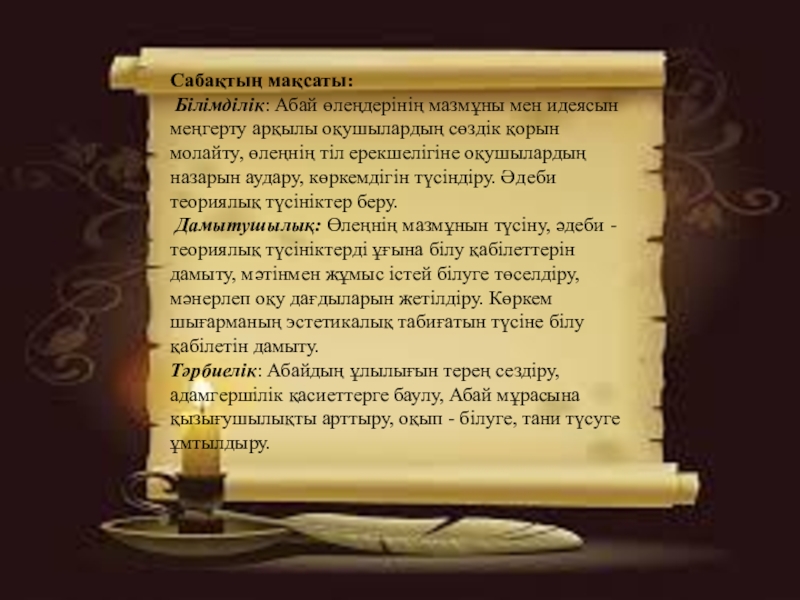 Тәрбиелік: Абайдың ұлылығын терең сездіру, адамгершілік қасиеттерге баулу, Абай мұрасына қызығушылықты арттыру, оқып - білуге, тани түсуге ұмтылдыру.