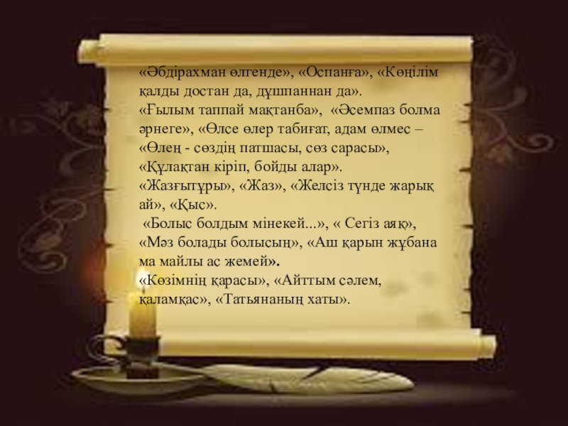Слайд 5«Әбдірахман өлгенде», «Оспанға», «Көңілім қалды достан да, дұшпаннан да».