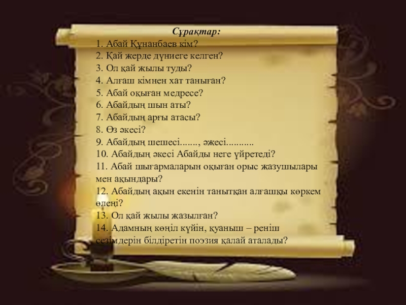 мақтанба», «Әсемпаз болма әрнеге», «Өлсе өлер табиғат, адам өлмес – «Өлең - сөздің патшасы, сөз сарасы», «Құлақтан кіріп, бойды алар».