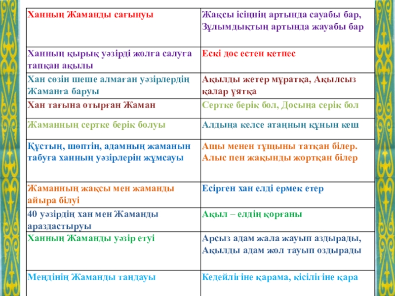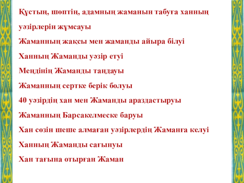 1.Жаман өзі хан болған соң ордасының маңдайшасына не шегелеп қойды? Неліктен? (Жыртық тоны мен жаман тымағы)