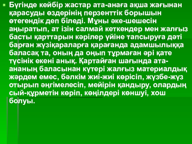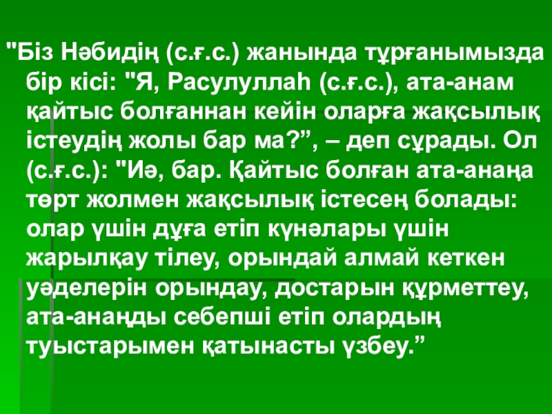 «Әке-шешеге жасалған жақсылық бақытсыздықты бақыттылыққа айналдырады, өмірді ұзартады және адамды жаман өлімнен қорғайды.» (Әбу Нуаим)