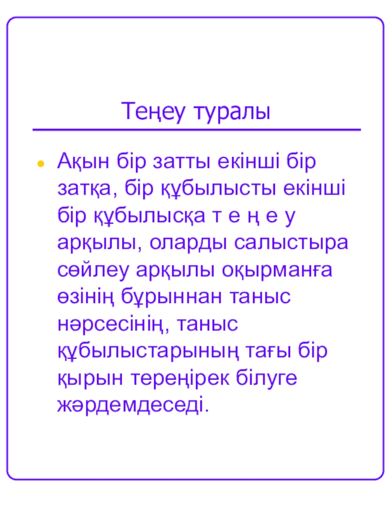 құбылысқа т е ң е у арқылы, оларды салыстыра сөйлеу арқылы оқырманға өзінің бұрыннан таныс нәрсесінің, таныс құбылыстарының тағы бір қырын тереңірек білуге жәрдемдеседі.