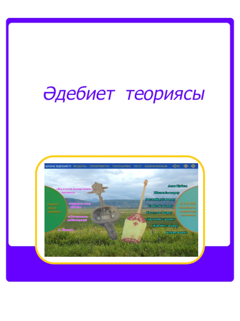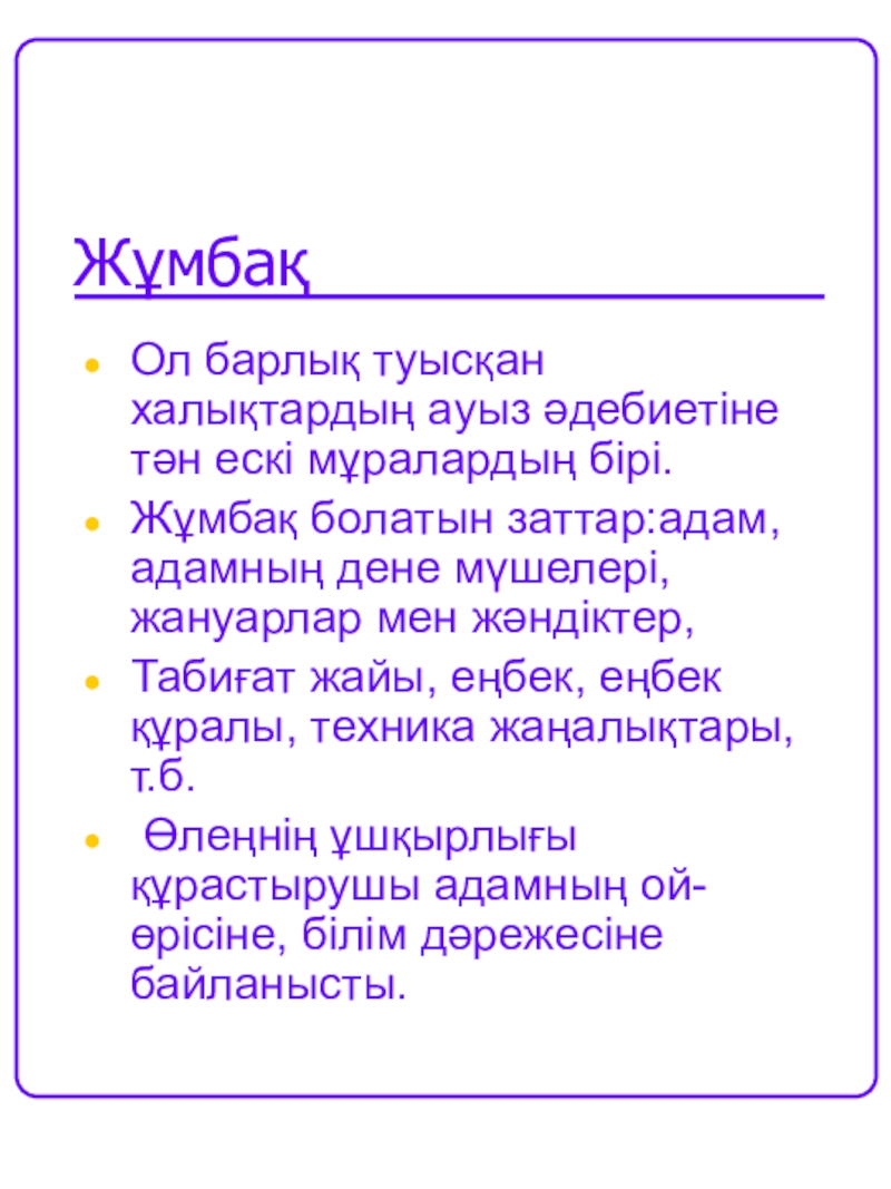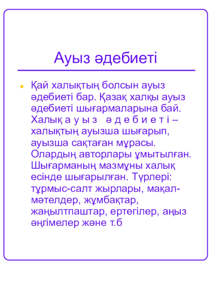шығармаларына бай. Халық а у ы з ә д е б и е т і – халықтың ауызша шығарып, ауызша сақтаған мұрасы. Олардың авторлары ұмытылған. Шығарманың мазмұны халық есінде шығарылған. Түрлері: тұрмыс-салт жырлары, мақал-мәтелдер, жұмбақтар,жаңылтпаштар, ертегілер, аңыз әңгімелер және т.б