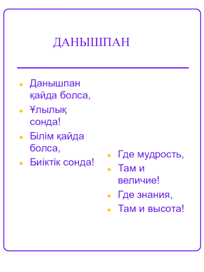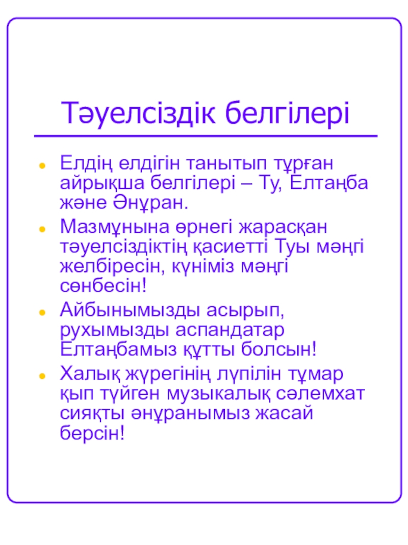 Мазмұнына өрнегі жарасқан тәуелсіздіктің қасиетті Туы мәңгі желбіресін, күніміз мәңгі сөнбесін!