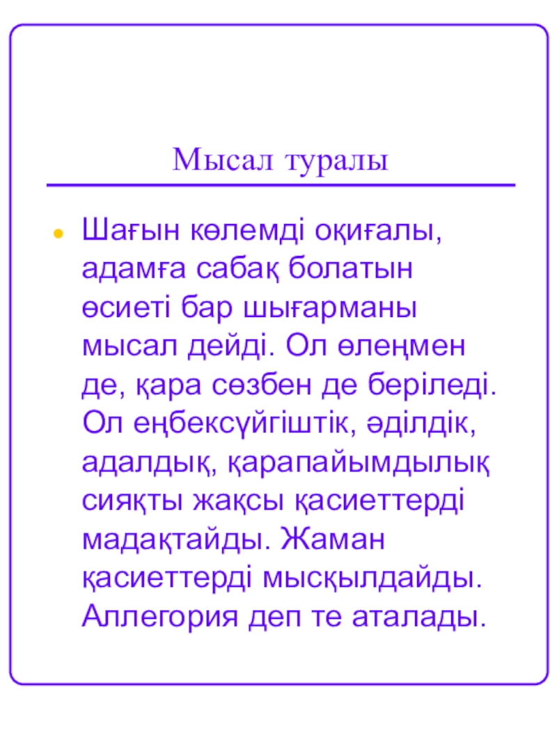 дейді. Ол өлеңмен де, қара сөзбен де беріледі. Ол еңбексүйгіштік, әділдік, адалдық, қарапайымдылық сияқты жақсы қасиеттерді мадақтайды. Жаман қасиеттерді мысқылдайды. Аллегория деп те аталады.