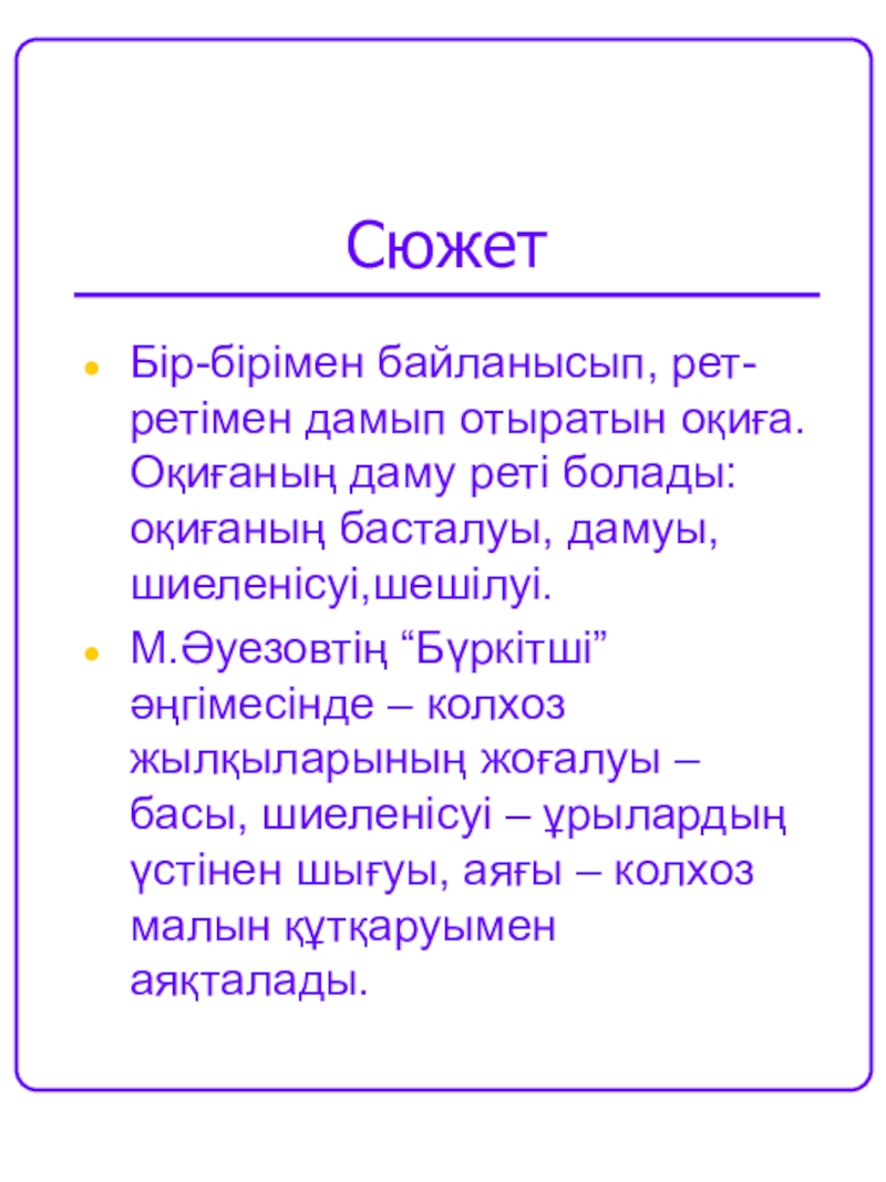 М.Әуезовтің “Бүркітші” әңгімесінде – колхоз жылқыларының жоғалуы – басы, шиеленісуі – ұрылардың үстінен шығуы, аяғы – колхоз малын құтқаруымен аяқталады.