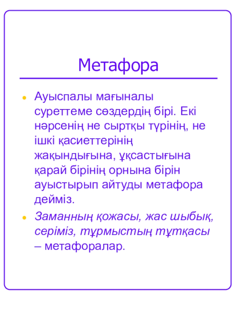 не ішкі қасиеттерінің жақындығына, ұқсастығына қарай бірінің орнына бірін ауыстырып айтуды метафора дейміз.