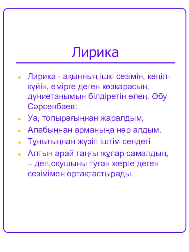 Лирика - ақынның ішкі сезімін, көңіл-күйін, өмірге деген көзқарасын, дүниетанымын