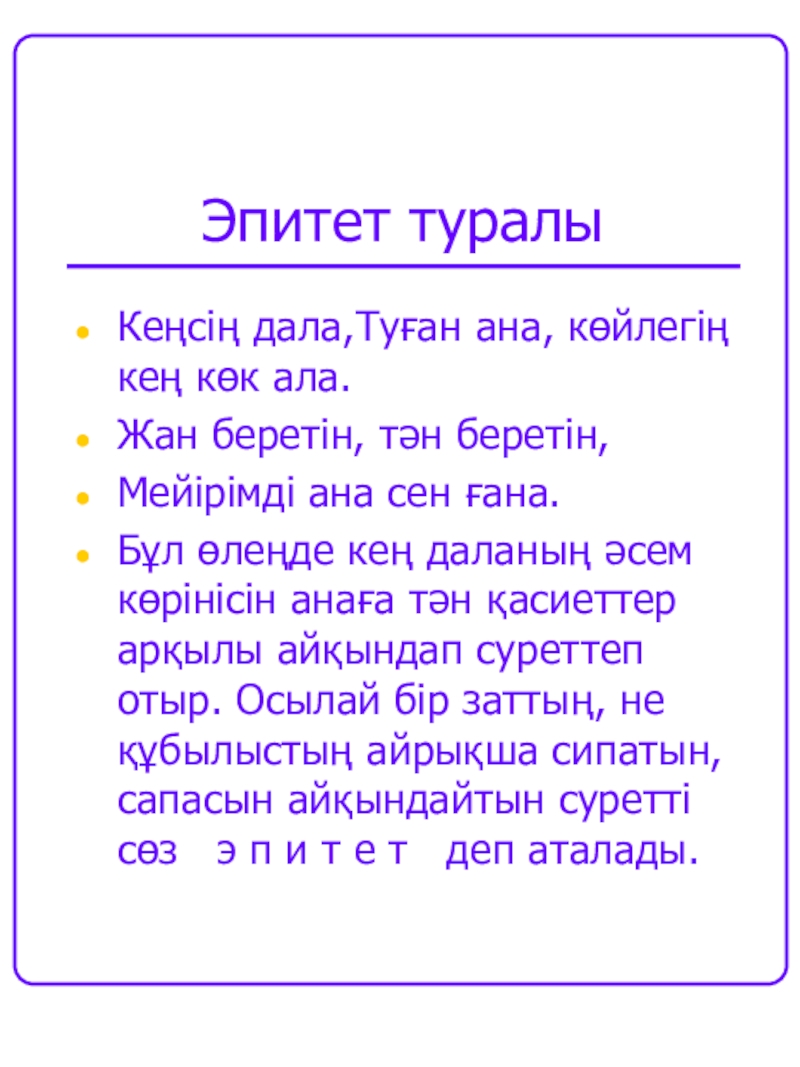 Бұл өлеңде кең даланың әсем көрінісін анаға тән қасиеттер арқылы айқындап суреттеп отыр. Осылай бір заттың, не құбылыстың айрықша сипатын, сапасын айқындайтын суретті сөз э п и т е т деп аталады.