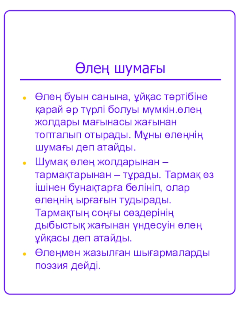 Өлең шумақтан, тармақтан, бунақтан,жолдан тұрады. Олардың өзіндік үндесу тәртібі болады. Дыбыс жағынан үндесіп, ойды ажарландыра түседі. Өлеңмен жазылған шығарманы поэзия дейді.