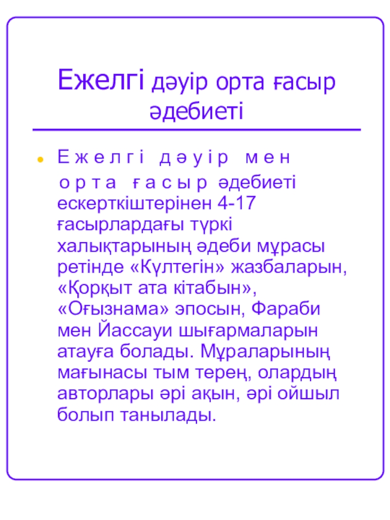 Слайд 3Ежелгі дәуір орта ғасыр әдебиеті