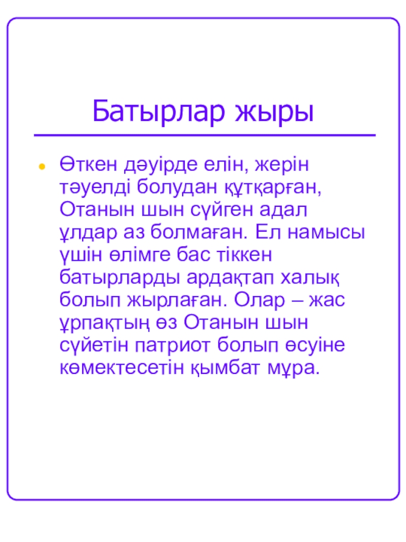 адал ұлдар аз болмаған. Ел намысы үшін өлімге бас тіккен батырларды ардақтап халық болып жырлаған. Олар – жас ұрпақтың өз Отанын шын сүйетін патриот болып өсуіне көмектесетін қымбат мұра.
