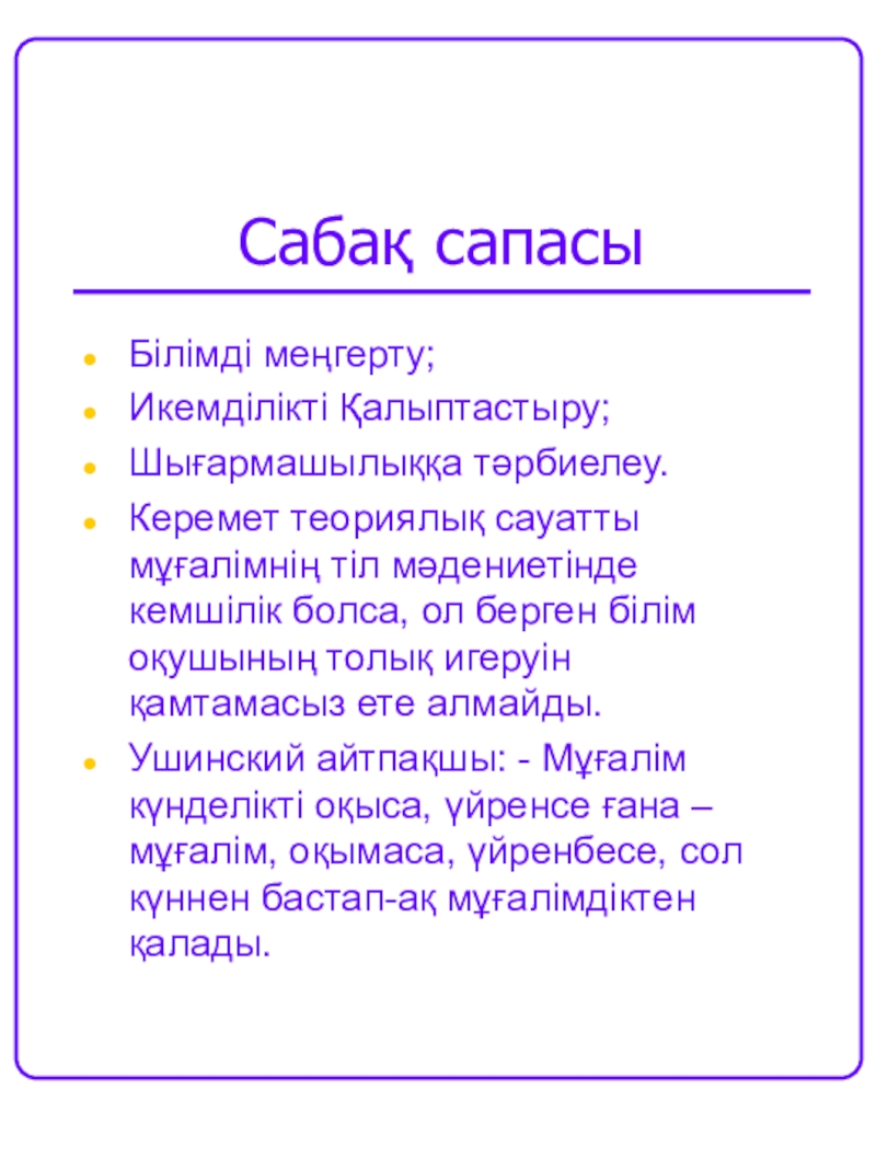 Ушинский айтпақшы: - Мұғалім күнделікті оқыса, үйренсе ғана – мұғалім, оқымаса, үйренбесе, сол күннен бастап-ақ мұғалімдіктен қалады.