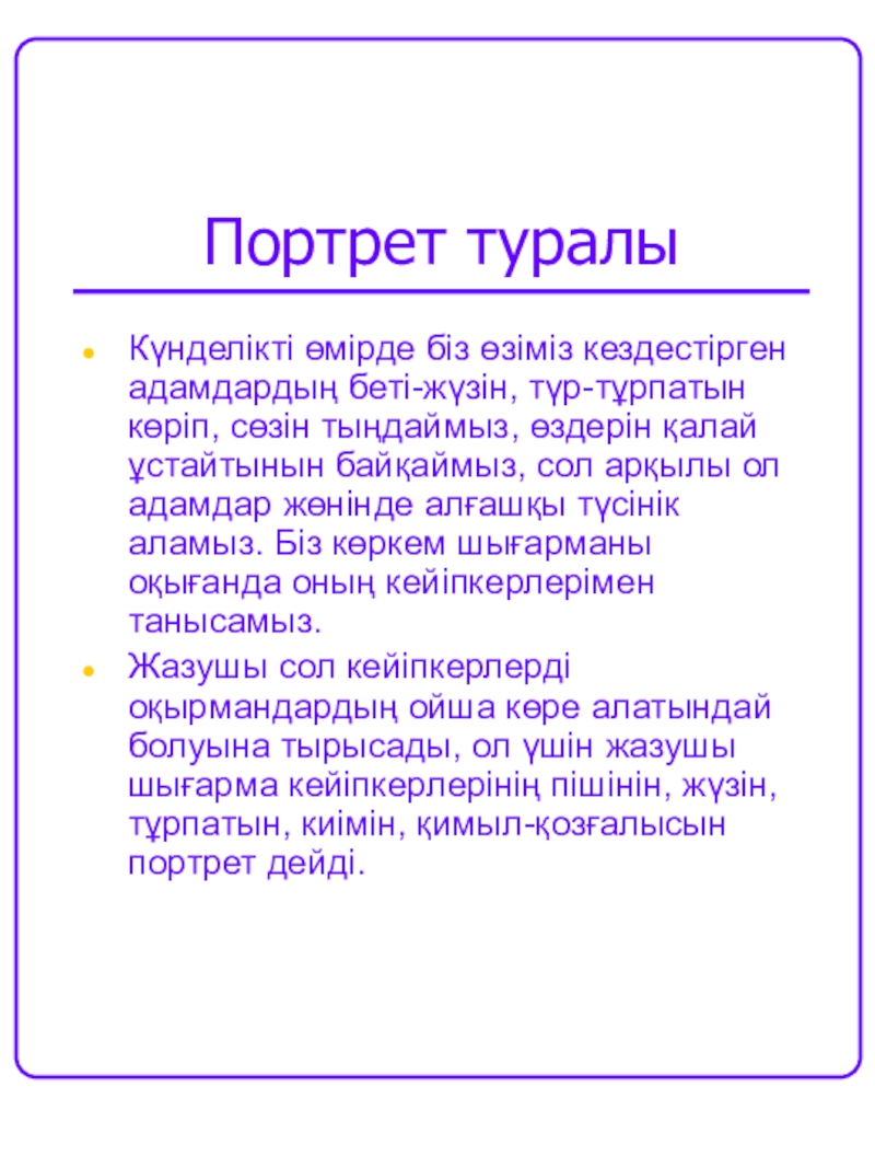 Жазушы сол кейіпкерлерді оқырмандардың ойша көре алатындай болуына тырысады, ол үшін жазушы шығарма кейіпкерлерінің пішінін, жүзін, тұрпатын, киімін, қимыл-қозғалысын портрет дейді.