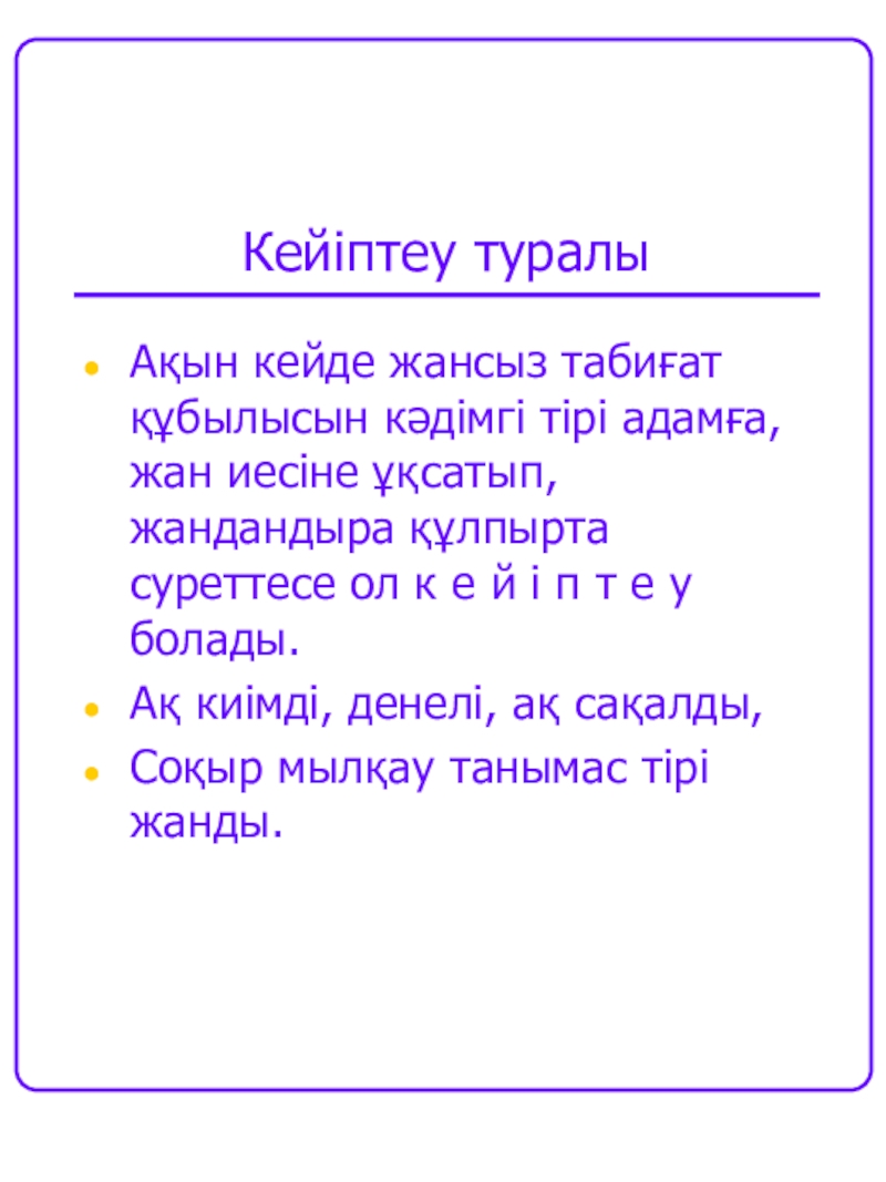 ұқсатып, жандандыра құлпырта суреттесе ол к е й і п т е у болады.