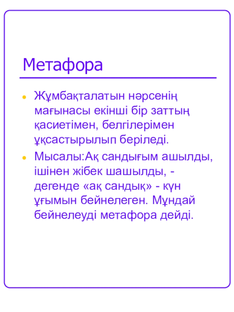 сандығым ашылды,ішінен жібек шашылды, - дегенде «ақ сандық» - күн ұғымын бейнелеген. Мұндай бейнелеуді метафора дейді.