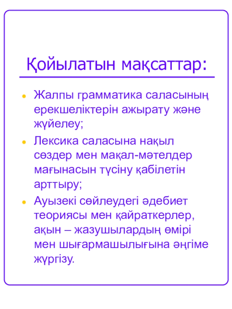 Ауызекі сөйлеудегі әдебиет теориясы мен қайраткерлер, ақын – жазушылардың өмірі мен шығармашылығына әңгіме жүргізу.
