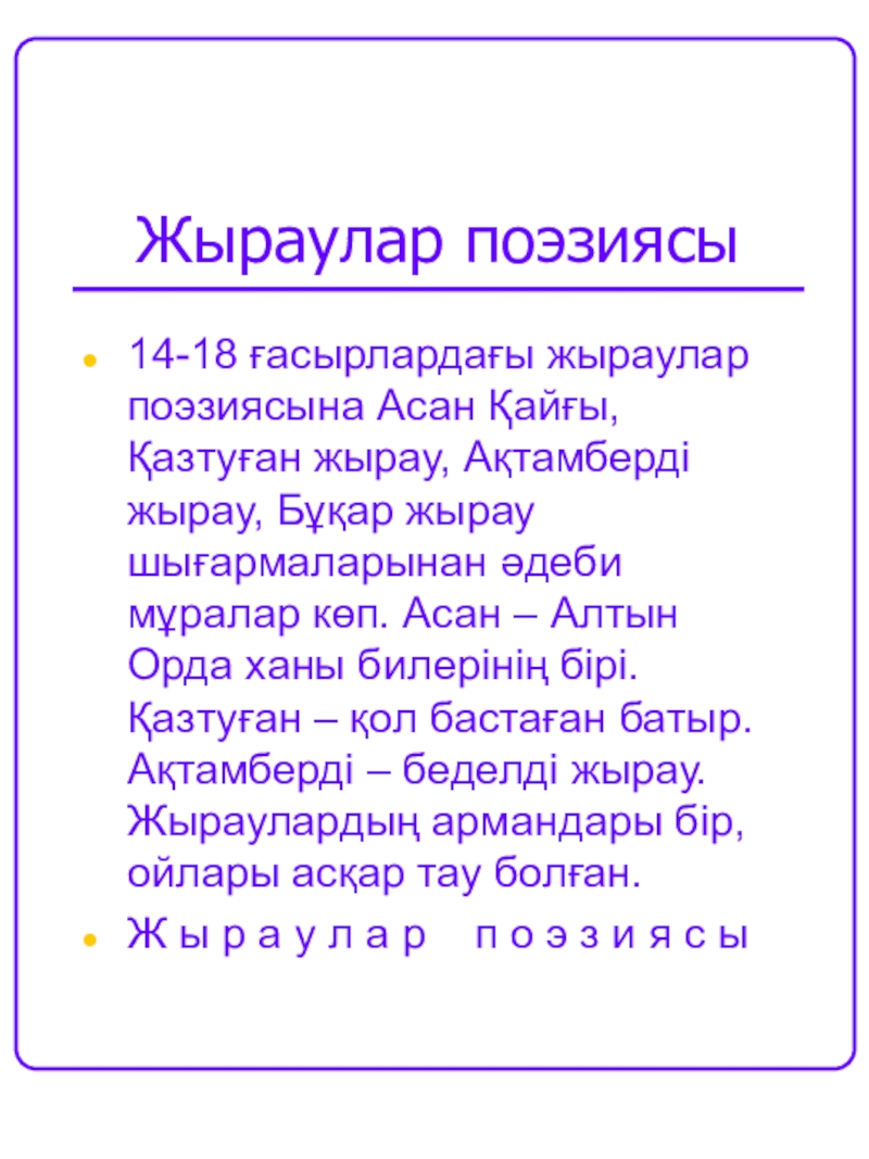 14-18 ғасырлардағы жыраулар поэзиясына Асан Қайғы, Қазтуған жырау, Ақтамберді жырау,