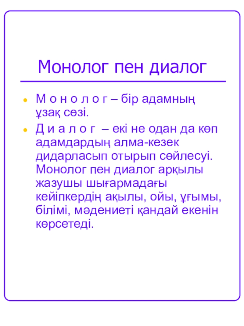 Д и а л о г – екі не одан да көп адамдардың алма-кезек дидарласып отырып сөйлесуі. Монолог пен диалог арқылы жазушы шығармадағы кейіпкердің ақылы, ойы, ұғымы, білімі, мәдениеті қандай екенін көрсетеді.