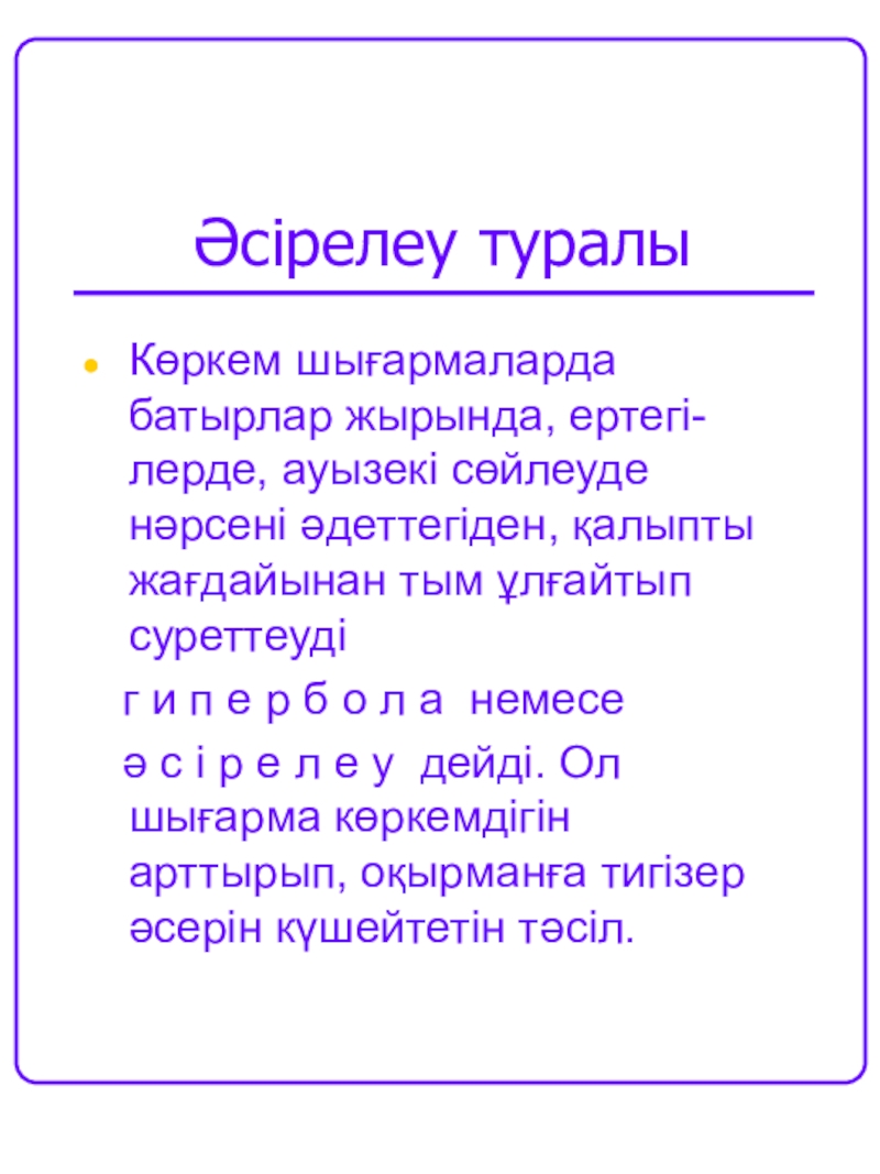 ә с і р е л е у дейді. Ол шығарма көркемдігін арттырып, оқырманға тигізер әсерін күшейтетін тәсіл.