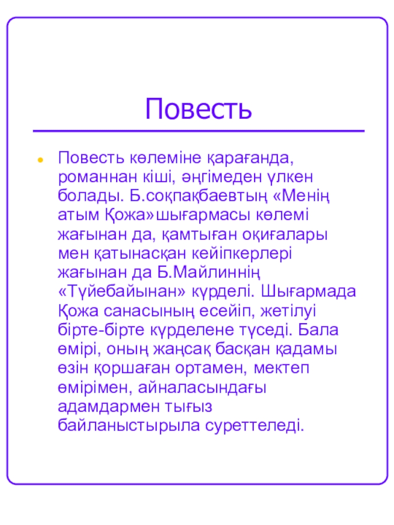 Повесть көлеміне қарағанда, романнан кіші, әңгімеден үлкен болады. Б.соқпақбаевтың «Менің