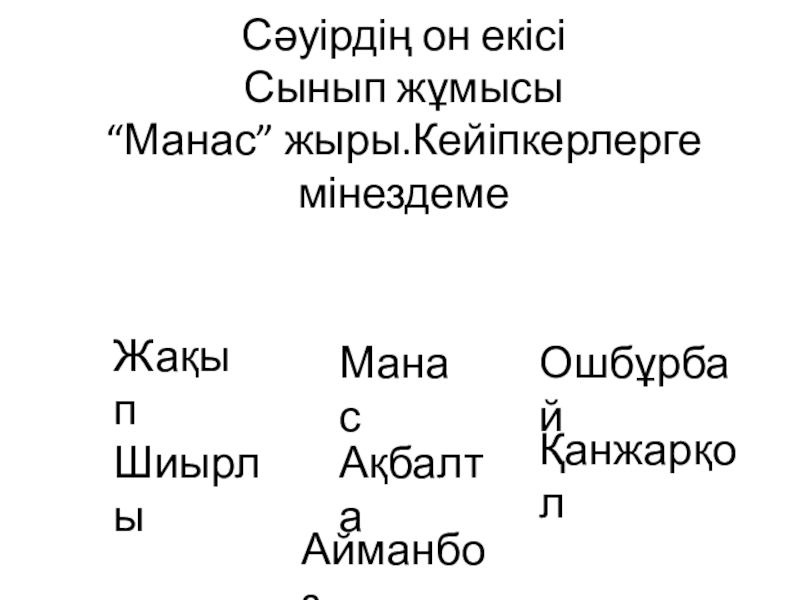 Сәуірдің он екісі Сынып жұмысы “Манас” жыры.Кейіпкерлерге мінездемеЖақыпШиырлыМанасАқбалтаОшбұрбайҚанжарқолАйманбоз
