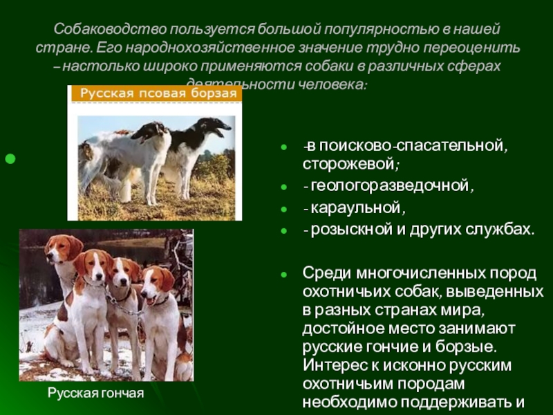 Среди многочисленных пород охотничьих собак, выведенных в разных странах мира, достойное место занимают русские гончие и борзые. Интерес к исконно русским охотничьим породам необходимо поддерживать и развивать – это наше национальное достояние.