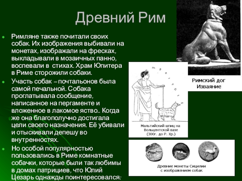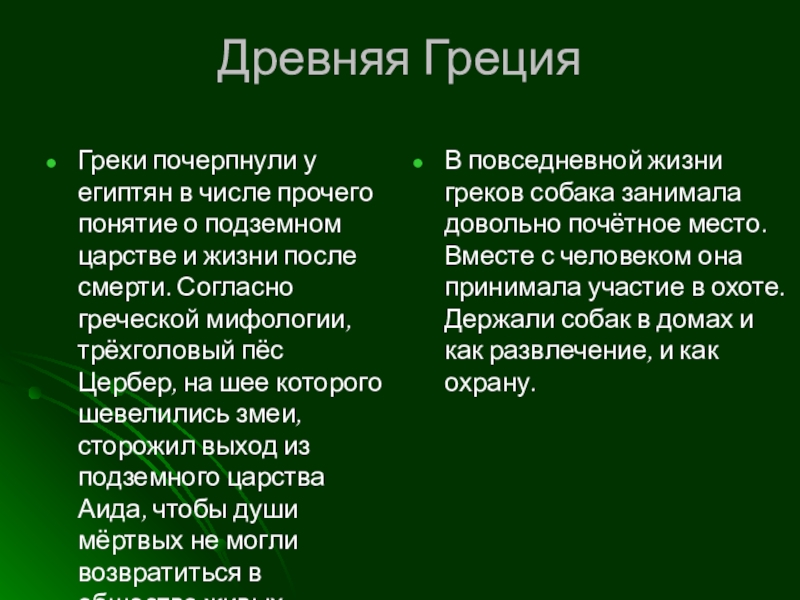 В повседневной жизни греков собака занимала довольно почётное место. Вместе с человеком она принимала участие в охоте. Держали собак в домах и как развлечение, и как охрану.