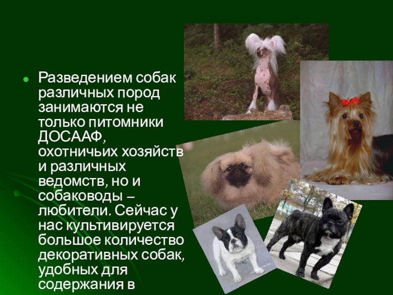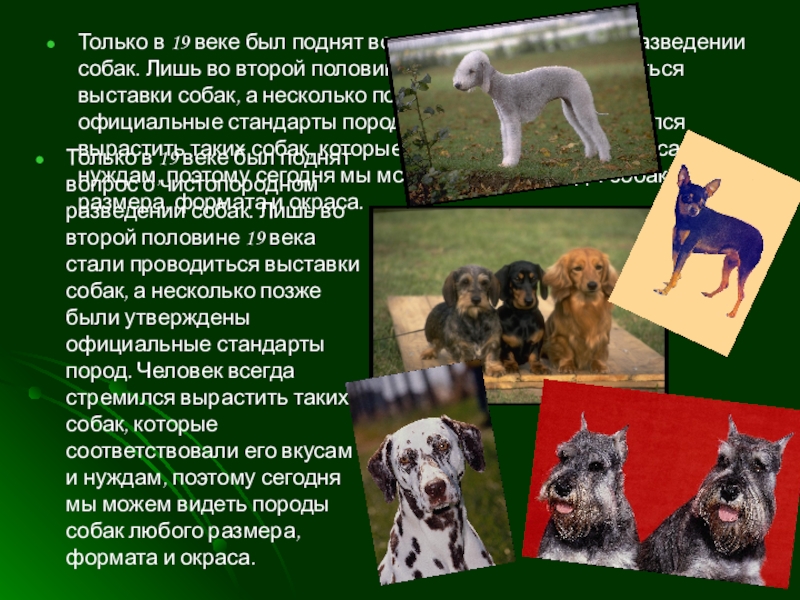 Только в 19 веке был поднят вопрос о чистопородном разведении собак. Лишь во второй половине 19 века стали проводиться выставки собак, а несколько позже были утверждены официальные стандарты пород. Человек всегда стремился вырастить таких собак, которые соответствовали его вкусам и нуждам, поэтому сегодня мы можем видеть породы собак любого размера, формата и окраса.
