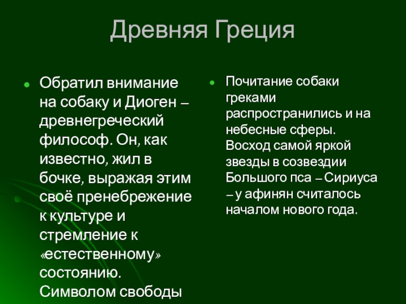 Почитание собаки греками распространились и на небесные сферы. Восход самой яркой звезды в созвездии Большого пса – Сириуса – у афинян считалось началом нового года.