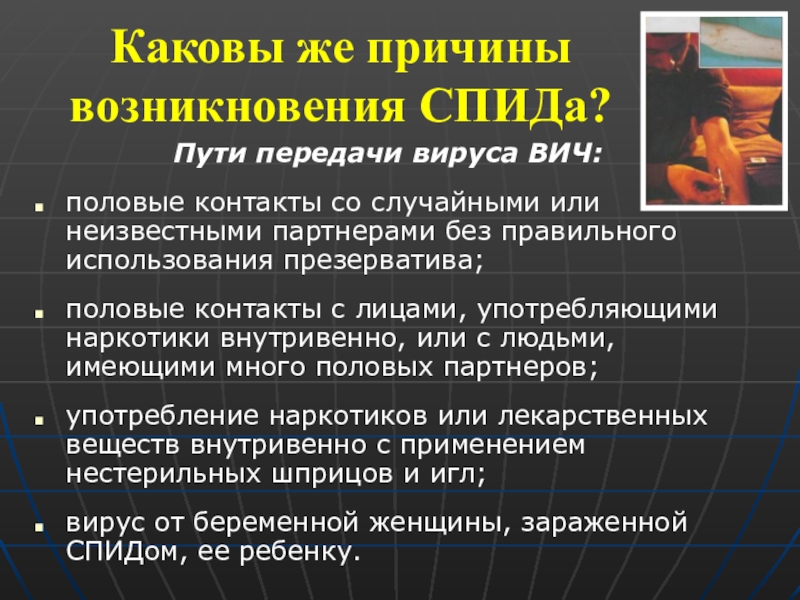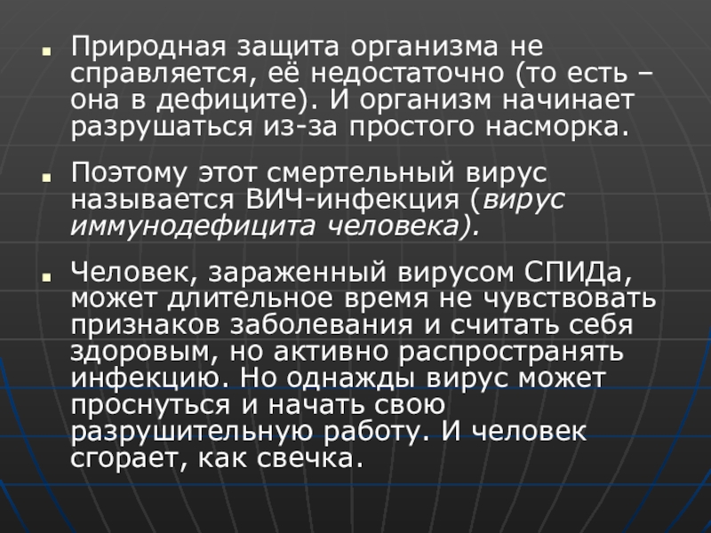 Человек, зараженный вирусом СПИДа (вирус ВИЧ – это ещё не болезнь), может заболеть и умереть от обычной простуды. Дело в том, что поражение организма этим вирусом ослабляет его защитные, иммунные силы (иммунитет – это невосприимчивость к разным болезням).