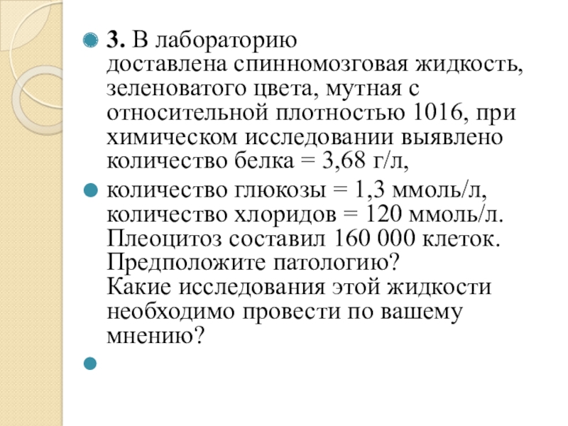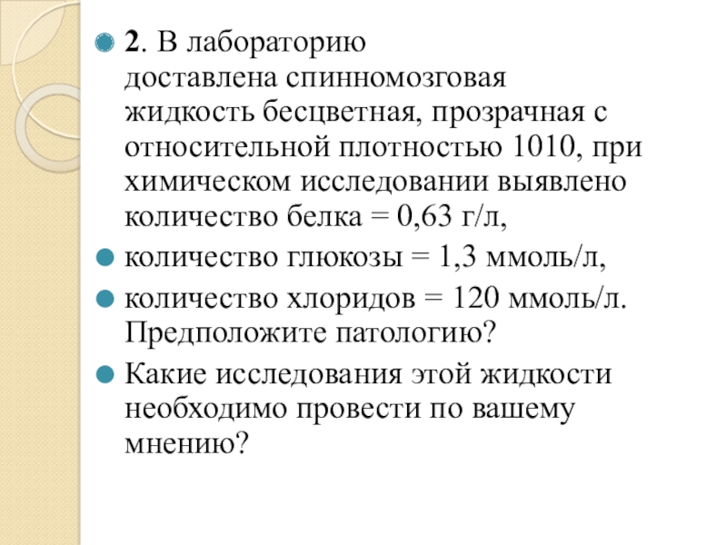 Слайд 192. В лабораторию доставлена спинномозговая жидкость бесцветная, прозрачная с относительной плотностью 1010, при
