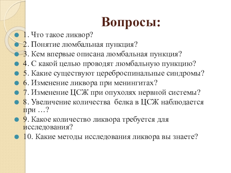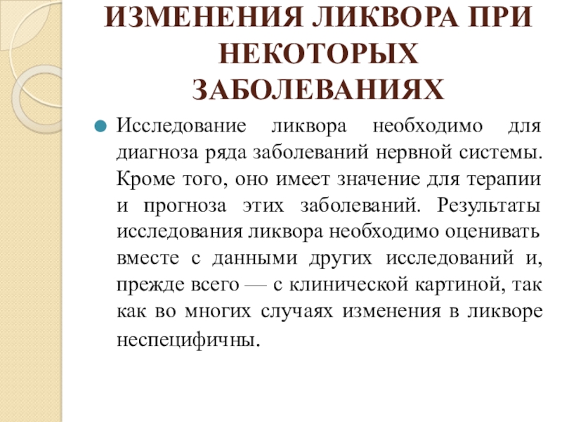 нервной системы. Кроме того, оно имеет значение для терапии и прогноза этих заболеваний. Результаты исследования ликвора необходимо оценивать вместе с данными других исследований и, прежде всего — с клинической картиной, так как во многих случаях изменения в ликворе неспецифичны.