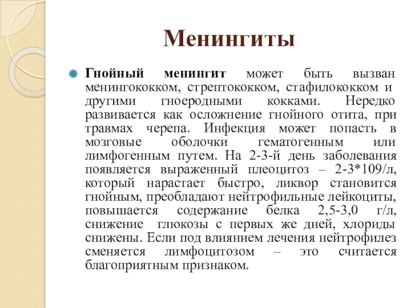 кокками. Нередко развивается как осложнение гнойного отита, при травмах черепа. Инфекция может попасть в мозговые оболочки гематогенным или лимфогенным путем. На 2-3-й день заболевания появляется выраженный плеоцитоз – 2-3*109/л, который нарастает быстро, ликвор становится гнойным, преобладают нейтрофильные лейкоциты, повышается содержание белка 2,5-3,0 г/л, снижение глюкозы с первых же дней, хлориды снижены. Если под влиянием лечения нейтрофилез сменяется лимфоцитозом – это считается благоприятным признаком.