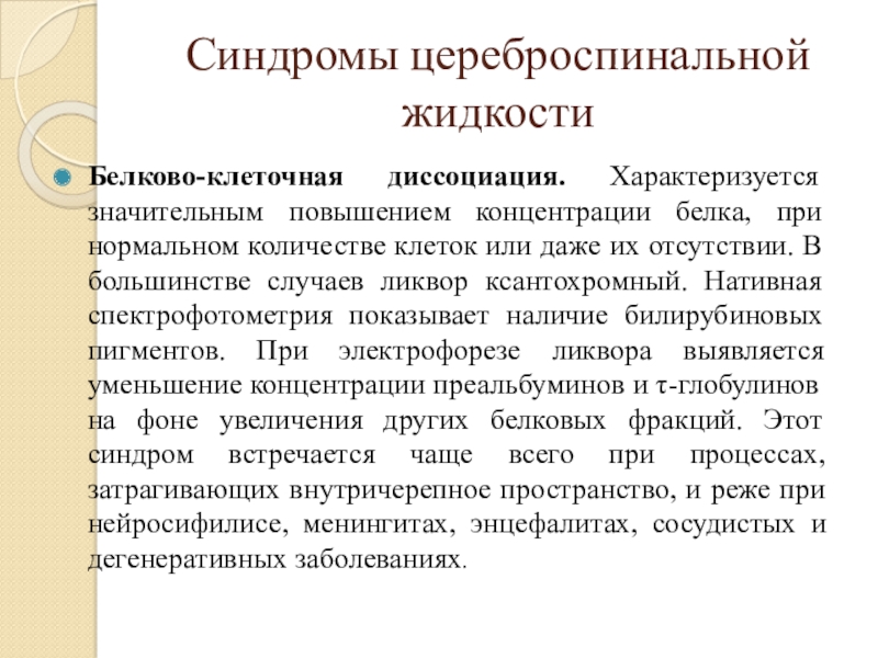 количестве клеток или даже их отсутствии. В большинстве случаев ликвор ксантохромный. Нативная спектрофотометрия показывает наличие билирубиновых пигментов. При электрофорезе ликвора выявляется уменьшение концентрации преальбуминов и τ-глобулинов на фоне увеличения других белковых фракций. Этот синдром встречается чаще всего при процессах, затрагивающих внутричерепное пространство, и реже при нейросифилисе, менингитах, энцефалитах, сосудистых и дегенеративных заболеваниях.
