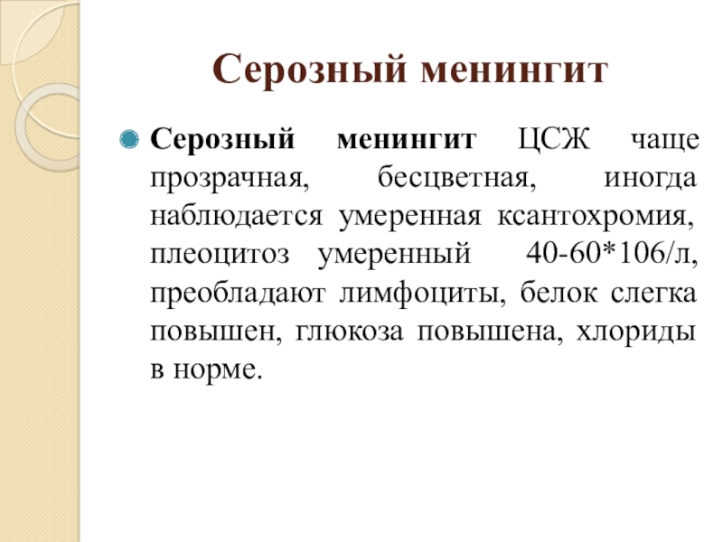 Серозный менингит ЦСЖ чаще прозрачная, бесцветная, иногда наблюдается умеренная ксантохромия,