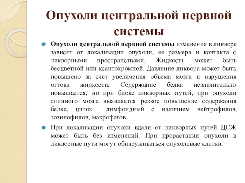 от локализации опухоли, ее размера и контакта с ликворными пространствами. Жидкость может быть бесцветной или ксантохромной. Давление ликвора может быть повышено за счет увеличения объема мозга и нарушения оттока жидкости. Содержание белка незначительно повышается, но при блоке ликворных путей, при опухоли спинного мозга выявляется резкое повышение содержания белка, цитоз лимфоидный с наличием нейтрофилов, эозинофилов, макрофагов.