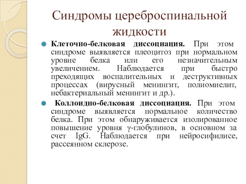 Клеточно-белковая диссоциация. При этом синдроме выявляется плеоцитоз при нормальном