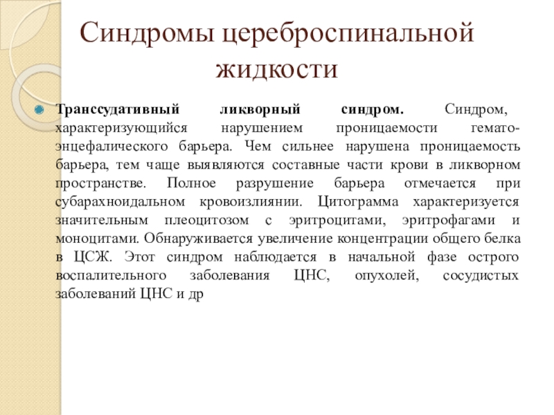 Транссудативный ликворный синдром. Синдром, характеризующийся нарушением проницаемости гемато-энцефалического барьера.