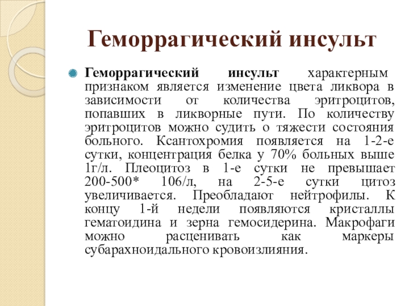 от количества эритроцитов, попавших в ликворные пути. По количеству эритроцитов можно судить о тяжести состояния больного. Ксантохромия появляется на 1-2-е сутки, концентрация белка у 70% больных выше 1г/л. Плеоцитоз в 1-е сутки не превышает 200-500* 106/л, на 2-5-е сутки цитоз увеличивается. Преобладают нейтрофилы. К концу 1-й недели появляются кристаллы гематоидина и зерна гемосидерина. Макрофаги можно расценивать как маркеры субарахноидального кровоизлияния.