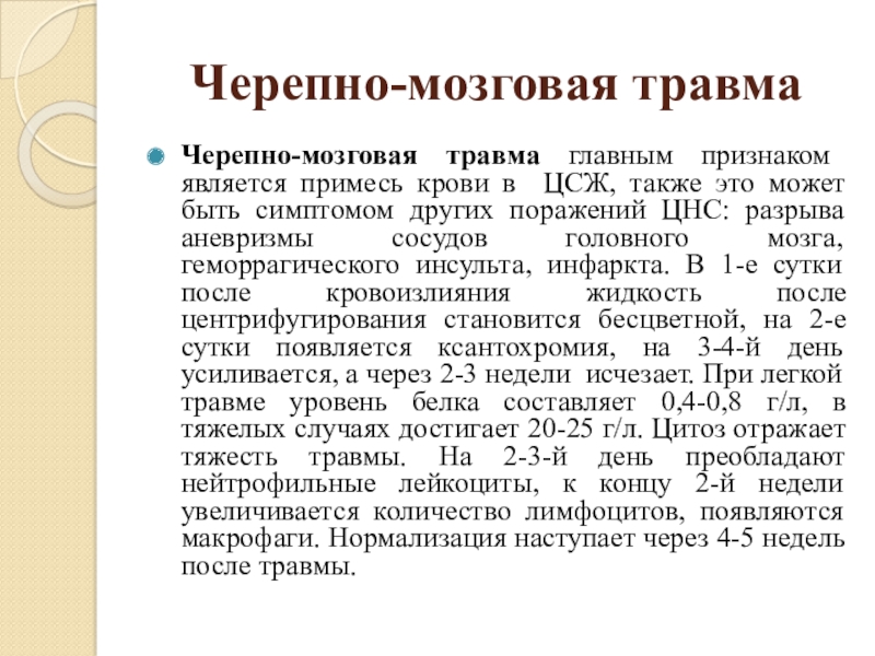 это может быть симптомом других поражений ЦНС: разрыва аневризмы сосудов головного мозга, геморрагического инсульта, инфаркта. В 1-е сутки после кровоизлияния жидкость после центрифугирования становится бесцветной, на 2-е сутки появляется ксантохромия, на 3-4-й день усиливается, а через 2-3 недели исчезает. При легкой травме уровень белка составляет 0,4-0,8 г/л, в тяжелых случаях достигает 20-25 г/л. Цитоз отражает тяжесть травмы. На 2-3-й день преобладают нейтрофильные лейкоциты, к концу 2-й недели увеличивается количество лимфоцитов, появляются макрофаги. Нормализация наступает через 4-5 недель после травмы.