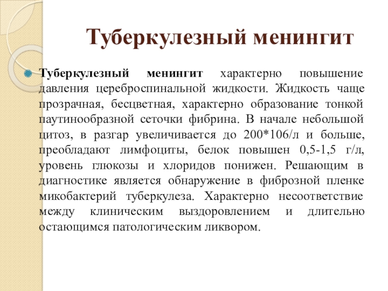 Туберкулезный менингит характерно повышение давления цереброспинальной жидкости. Жидкость чаще прозрачная,