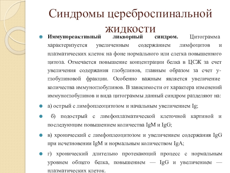 плазматических клеток на фоне нормального или слегка повышенного цитоза. Отмечается повышение концентрации белка в ЦСЖ за счет увеличения содержания глобулинов, главным образом за счет у-глобулиновой фракции. Особенно важным является увеличение количества иммуноглобулинов. В зависимости от характера изменений иммуноглобулинов и вида цитограммы данный синдром разделяют на: