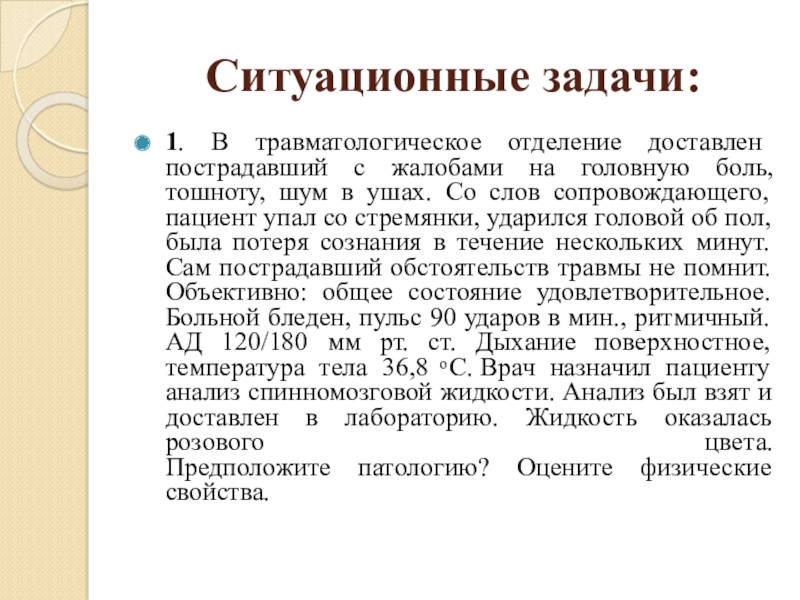 боль, тошноту, шум в ушах. Со слов сопровождающего, пациент упал со стремянки, ударился головой об пол, была потеря сознания в течение нескольких минут. Сам пострадавший обстоятельств травмы не помнит. Объективно: общее состояние удовлетворительное. Больной бледен, пульс 90 ударов в мин., ритмичный. АД 120/180 мм рт. ст. Дыхание поверхностное, температура тела 36,8 ͦ С. Врач назначил пациенту анализ спинномозговой жидкости. Анализ был взят и доставлен в лабораторию. Жидкость оказалась розового цвета.