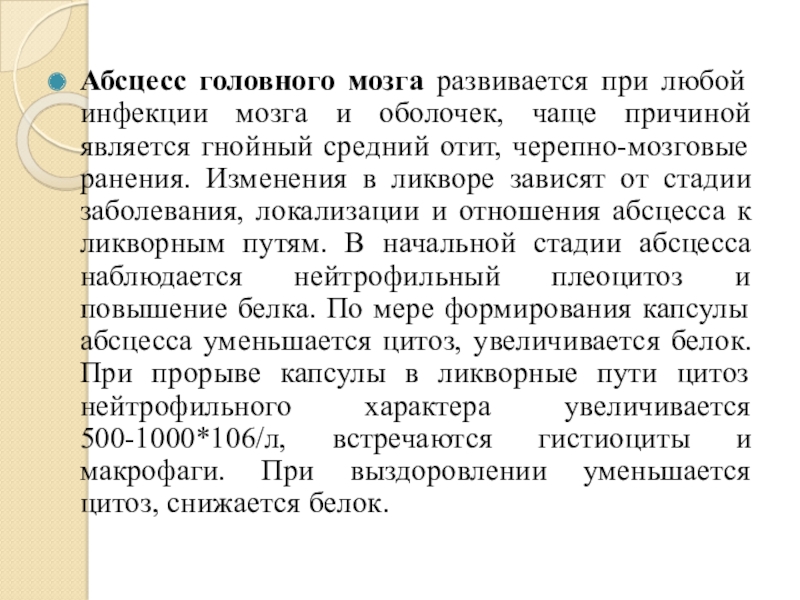 причиной является гнойный средний отит, черепно-мозговые ранения. Изменения в ликворе зависят от стадии заболевания, локализации и отношения абсцесса к ликворным путям. В начальной стадии абсцесса наблюдается нейтрофильный плеоцитоз и повышение белка. По мере формирования капсулы абсцесса уменьшается цитоз, увеличивается белок. При прорыве капсулы в ликворные пути цитоз нейтрофильного характера увеличивается 500-1000*106/л, встречаются гистиоциты и макрофаги. При выздоровлении уменьшается цитоз, снижается белок.