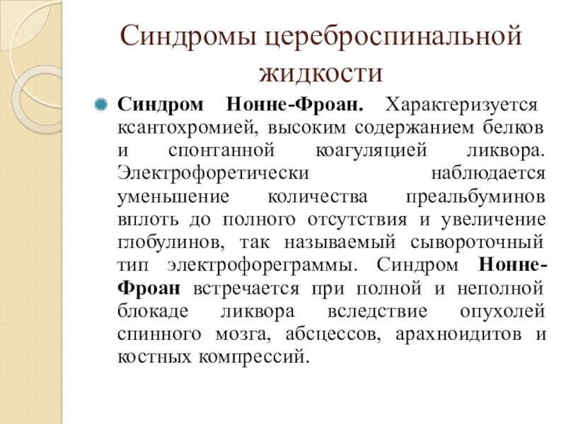 коагуляцией ликвора. Электрофоретически наблюдается уменьшение количества преальбуминов вплоть до полного отсутствия и увеличение глобулинов, так называемый сывороточный тип электрофореграммы. Синдром Нонне-Фроан встречается при полной и неполной блокаде ликвора вследствие опухолей спинного мозга, абсцессов, арахноидитов и костных компрессий.