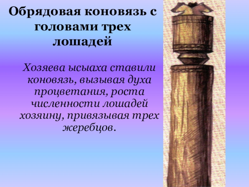 Слайд 16Обрядовая коновязь с головами трех лошадей